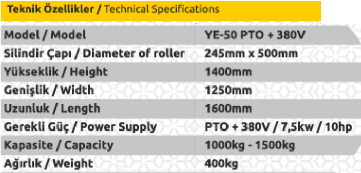 Öne Çıkan Özellikler: Çalışma Sistemi: PTO (traktör kuyruk mili) Kapasite: 1000 kg – 1500 kg / saat Silindir Çapı: 245 mm x 500 mm Boyutlar: Uzunluk 1600 mm – Genişlik 950 mm – Yükseklik 1400 mm Ağırlık: 300 kg